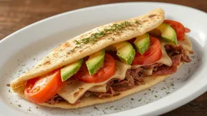Rellena con Salame italiano, Carne Mechada (Cocción 8 hrs.) Tomate, Queso gauda, Palta en Láminas.
